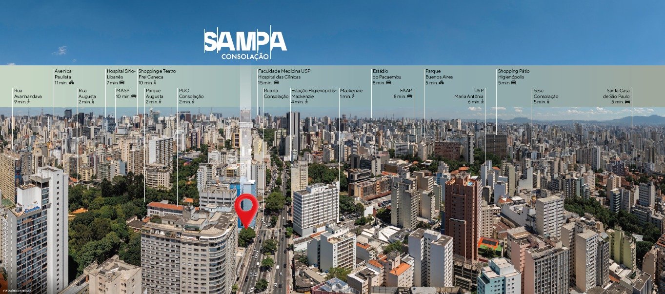 Na Rua da Consolação, a 30 metros da Universidade Mackenzie e 240 metros do metrô Higienópolis-Mackenzie, o Sampa oferece mobilidade total. Estudar, trabalhar ou aproveitar a cidade fica mais fácil com tudo por perto.